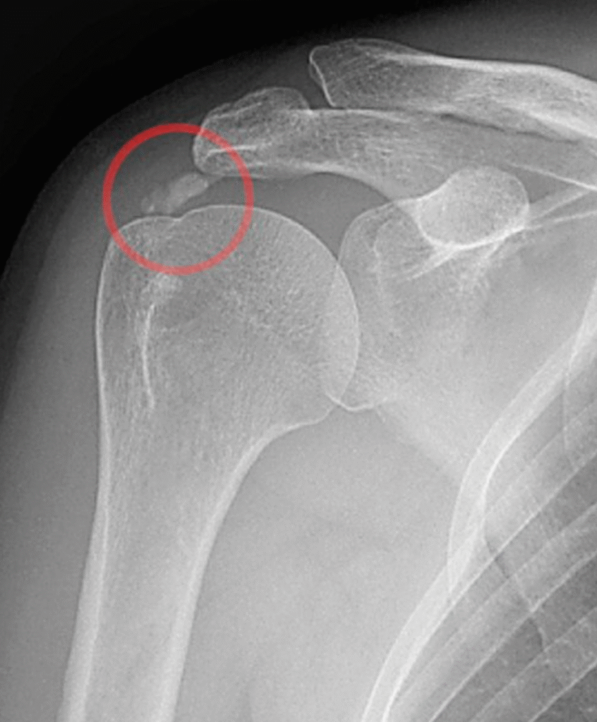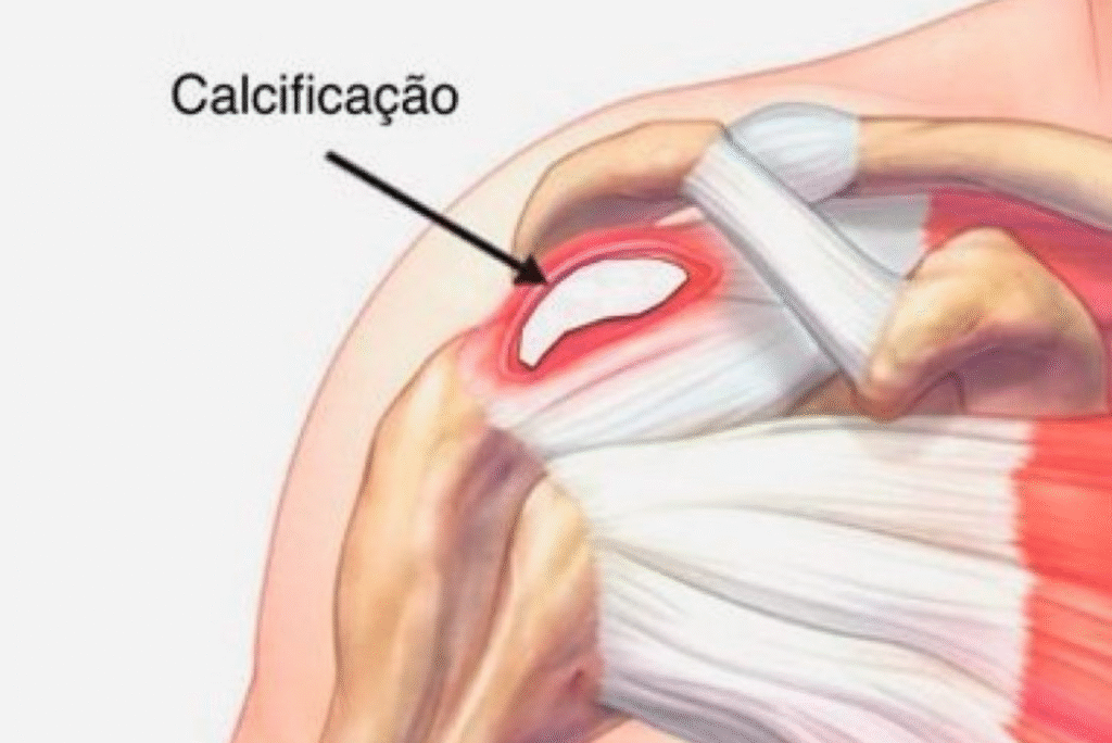 A tendinite calcária ocorre quando há depósito de cristais de cálcio dentro dos tendões do ombro, principalmente no supraespinal, que faz parte do manguito rotador.